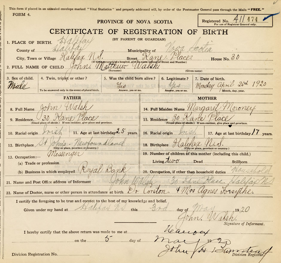 21. Name and Post Office address of Informant John Walsh 30 Kane Place, Halifax
