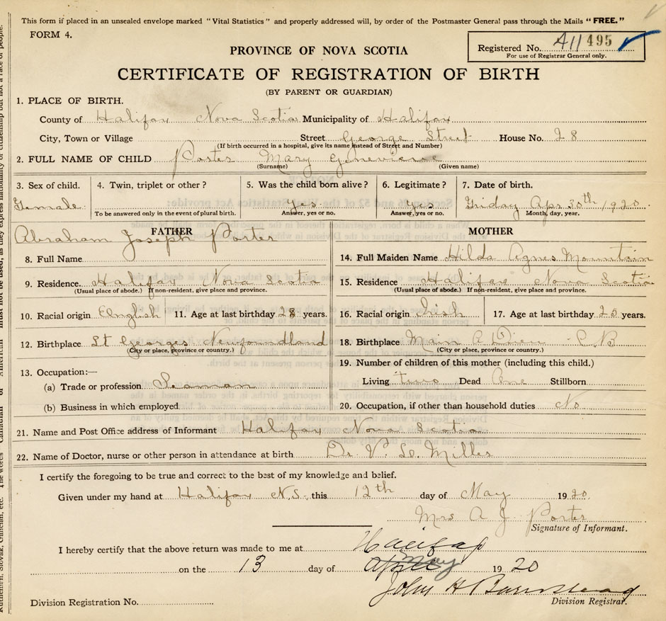 21. Name and Post Office address of Informant Mrs. A. J. Porter Halifax