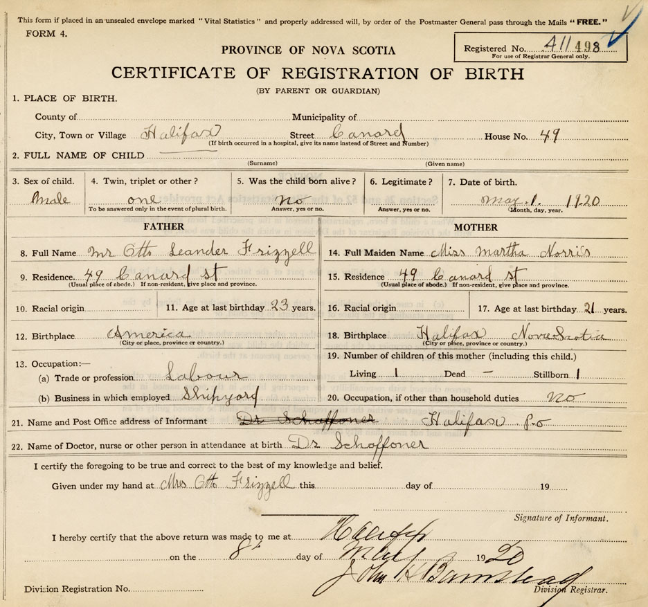 21. Name and Post Office address of Informant Mrs. Otto Frizzell Halifax P.O.