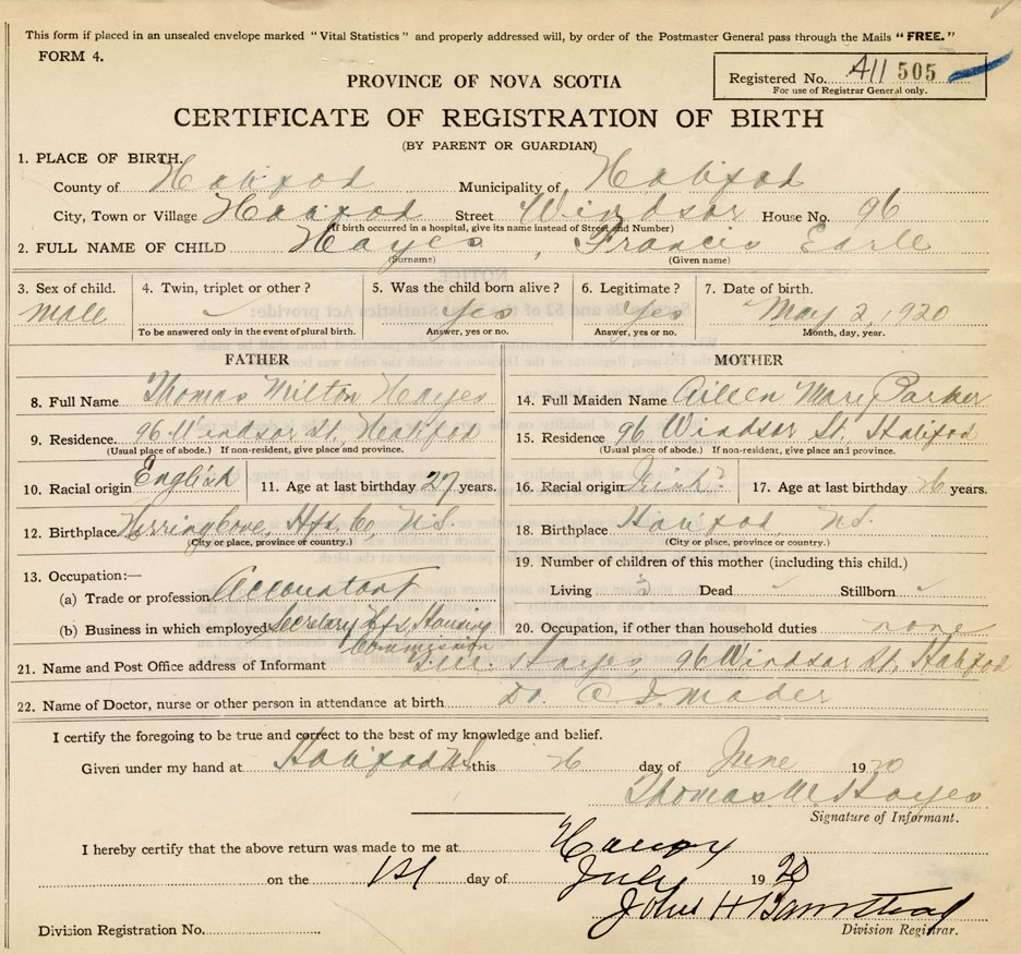 21. Name and Post Office address of Informant T. M. Hayes 96 Windsor St., Halifax