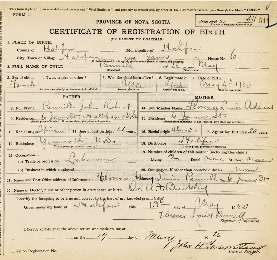 21. Name and Post Office address of Informant Florence Louise Pannill 6 James Street, Halifax