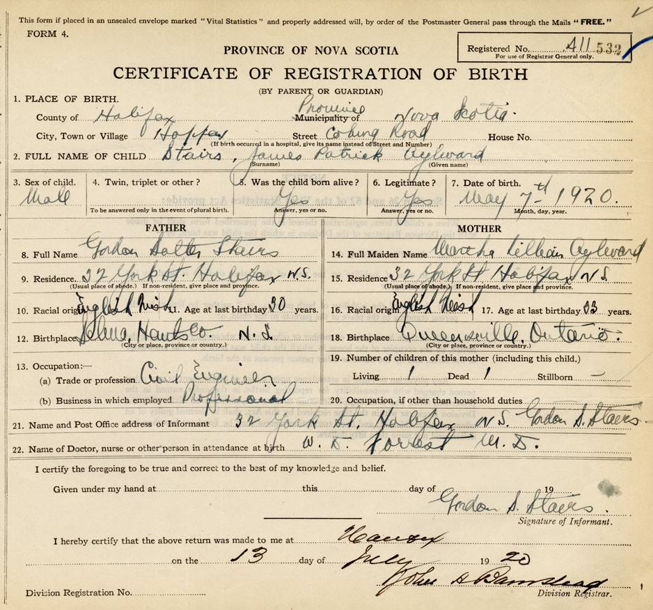 21. Name and Post Office address of Informant Gordon S. Stairs 32 York St., Halifax