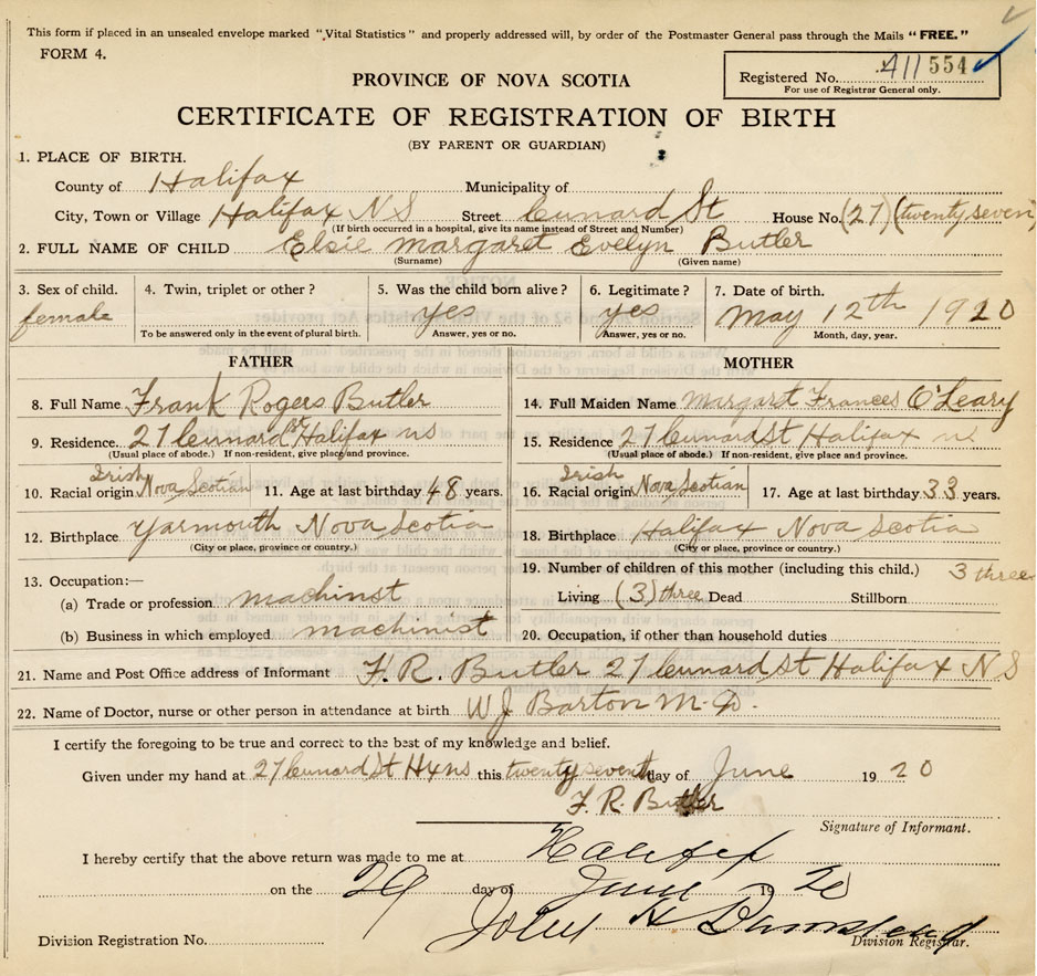 21. Name and Post Office address of Informant F. R. Butler 27 Cunnard St., Halifax