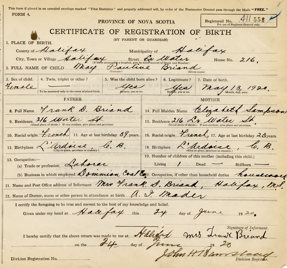 21. Name and Post Office address of Informant Mrs. Frank D. Briand Halifax