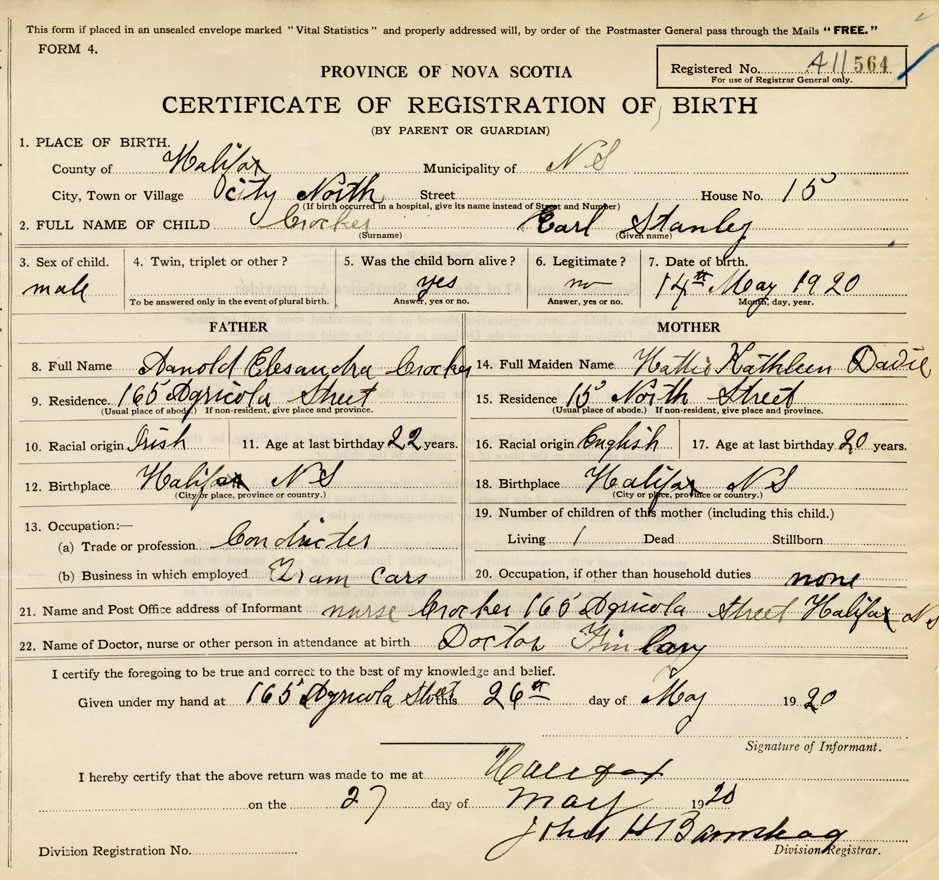 21. Name and Post Office address of Informant Nurse Crocker 165 Agricola Street, Halifax