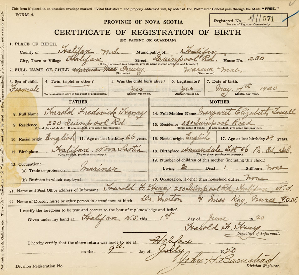 21. Name and Post Office address of Informant Harold F. Henry 230 Quinpool Rd., Halifax