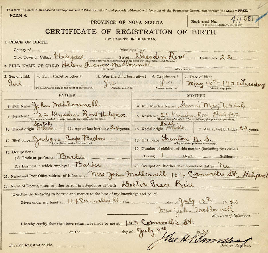 21. Name and Post Office address of Informant Mrs. John McDonnell 104 Cornwallis St., Halifax