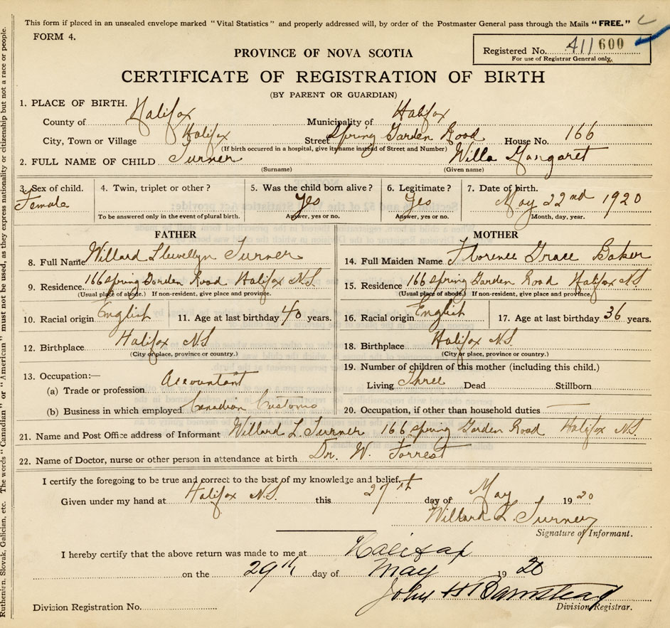 21. Name and Post Office address of Informant Willard L. Turner 166 Spring Garden Road, Halifax