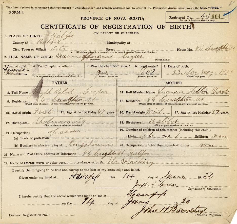 21. Name and Post Office address of Informant Joseph R. Cooper 86 Creighton St., Halifax