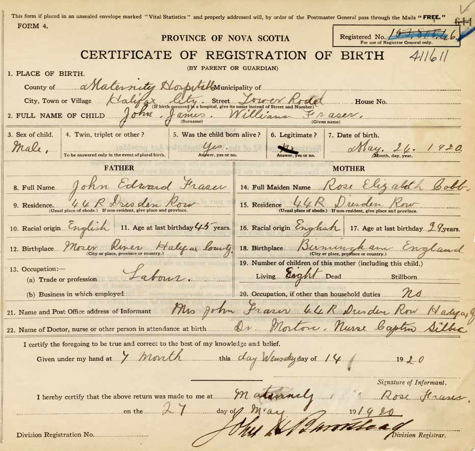 21. Name and Post Office address of Informant Mrs. John Fraser 44 R Dresden Row, Halifax