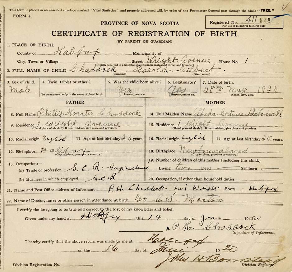 21. Name and Post Office address of Informant P. H. Chaddock No. 1 Wright Ave., Halifax