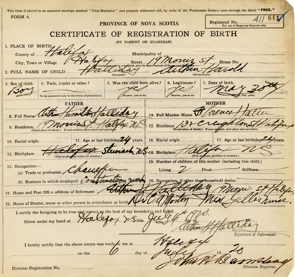 21. Name and Post Office address of Informant Arthur H. Halliday 19 Morris St., Halifax