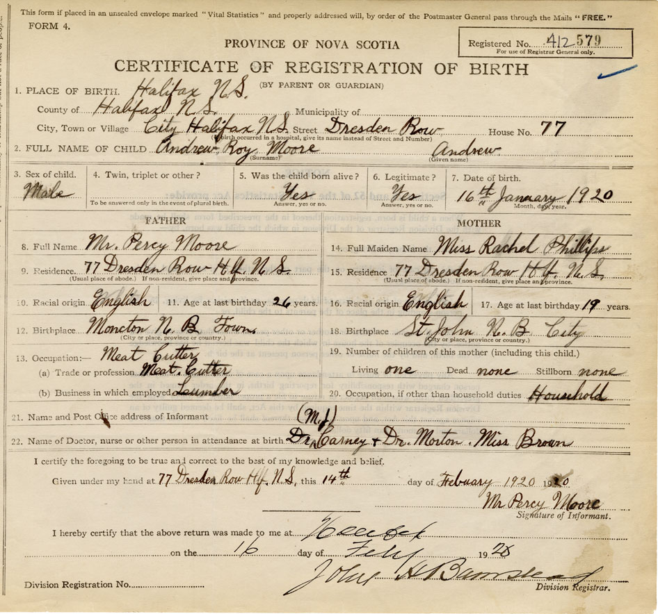 21. Name and Post Office address of Informant Mr. Percy Moore 77 Dresden Row, Halifax