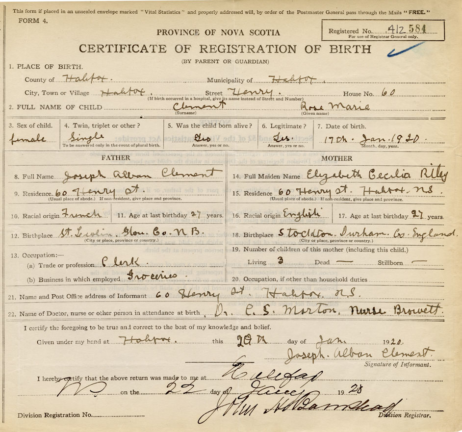 21. Name and Post Office address of Informant Joseph Alban Clement 60 Henry St., Halifax