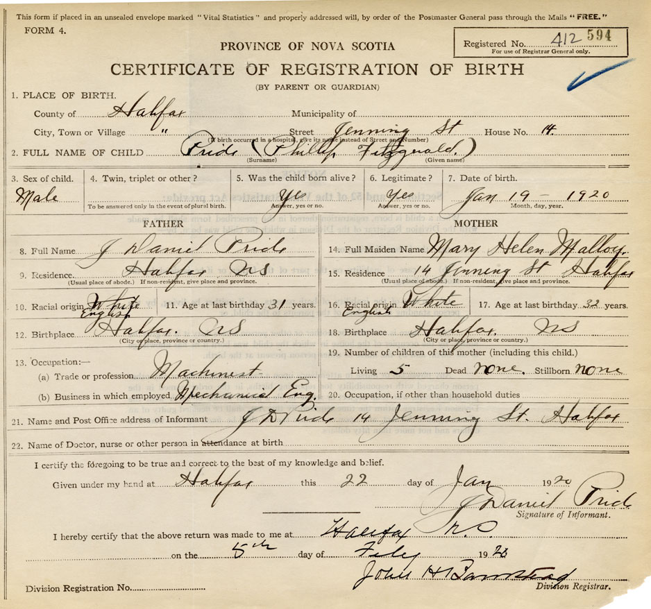 21. Name and Post Office address of Informant J. D. Pride 14 Jenning St., Halifax
