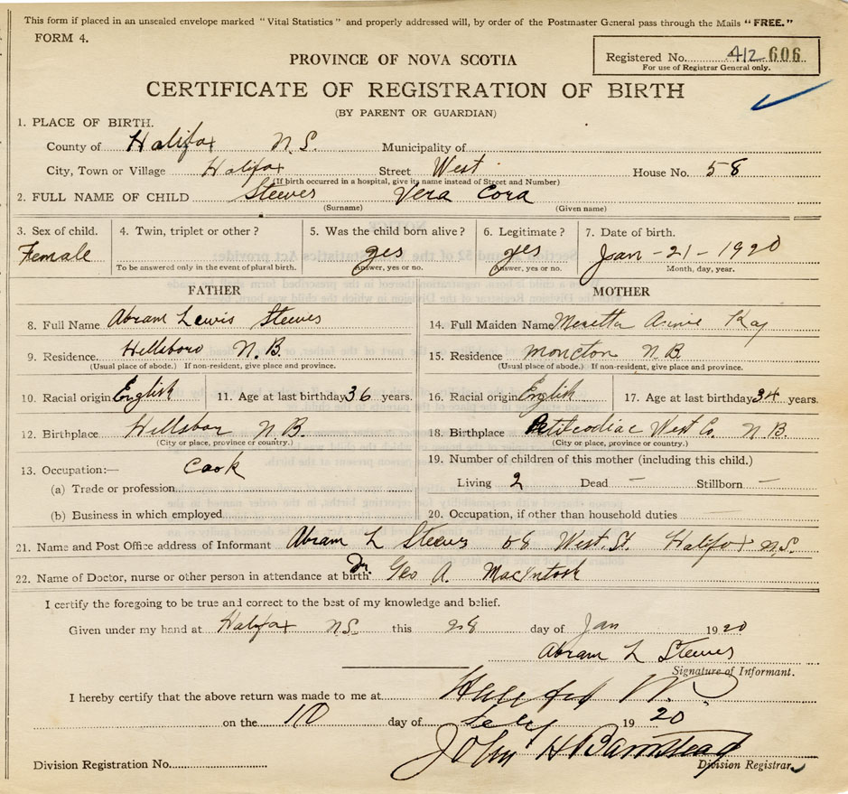 21. Name and Post Office address of Informant Abram L. Steeves 68 West St., Halifax