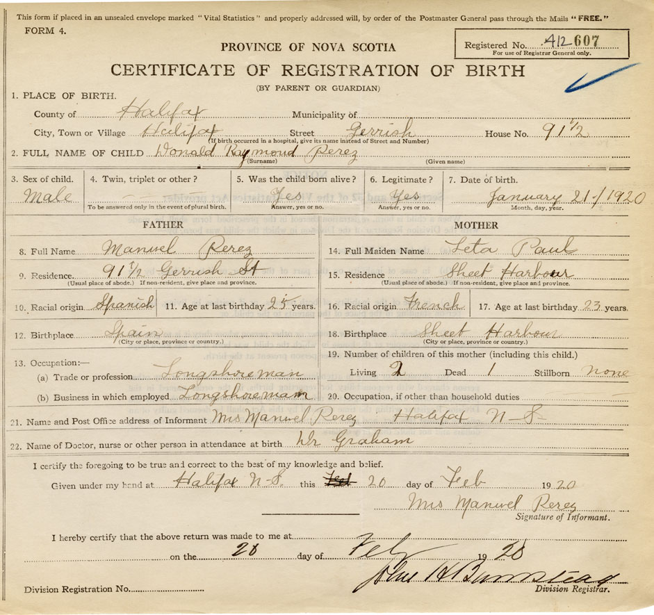 21. Name and Post Office address of Informant Mrs. Manuel Perez Halifax