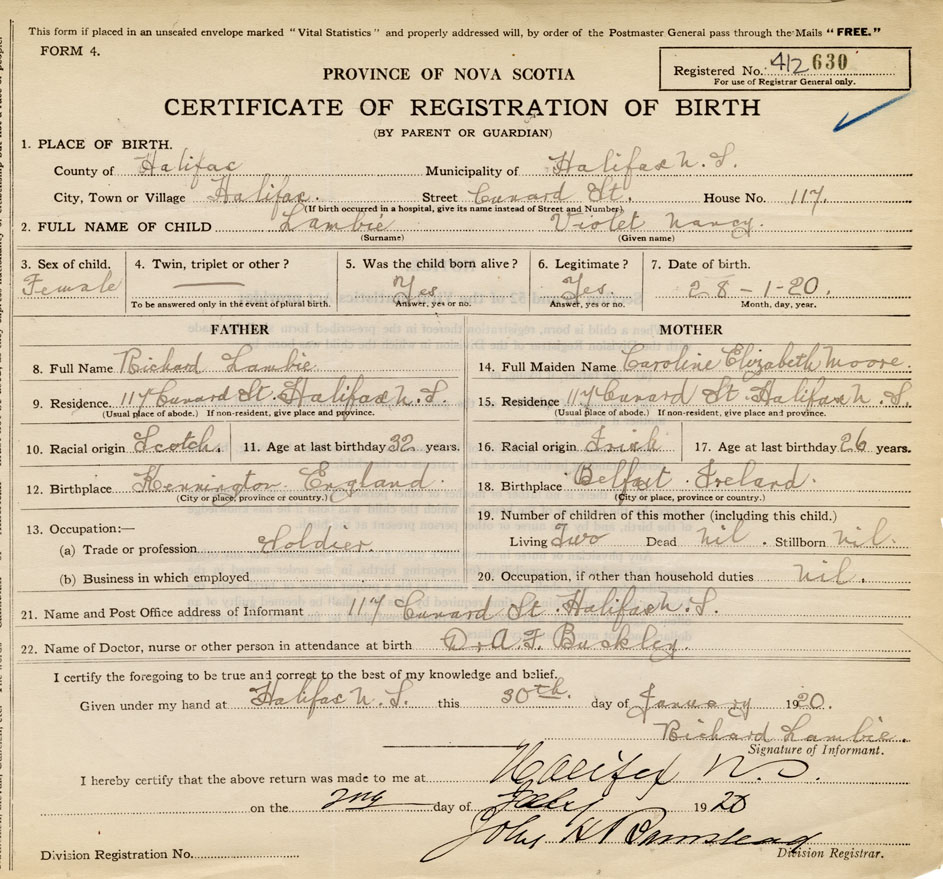 21. Name and Post Office address of Informant Richard Lambie 117 Cunard St., Halifax