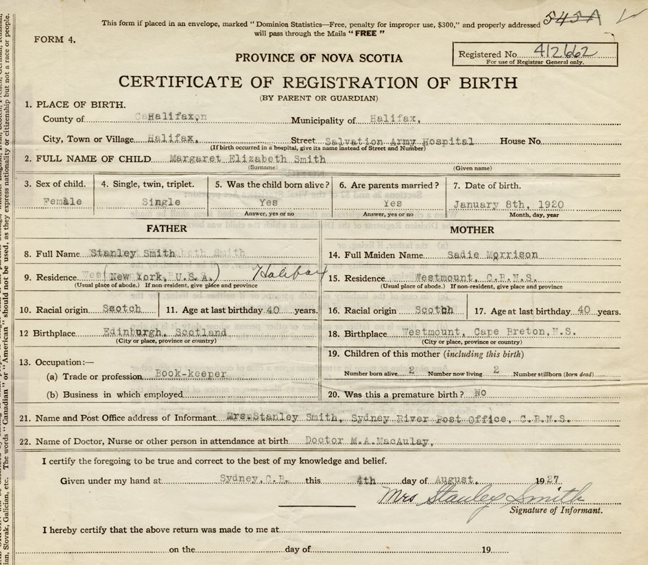 21. Name and Post Office address of Informant Mrs. Stanley Smith Sydney River Post Office