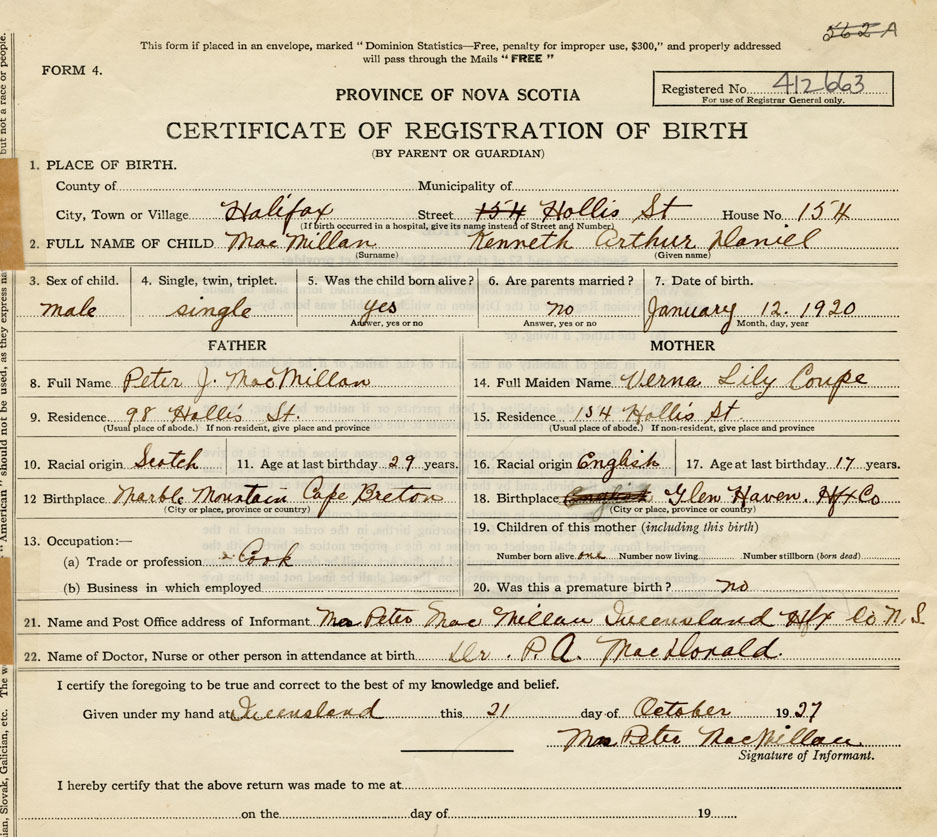 21. Name and Post Office address of Informant Mrs. Peter MacMillan Queensland, Halifax Co.