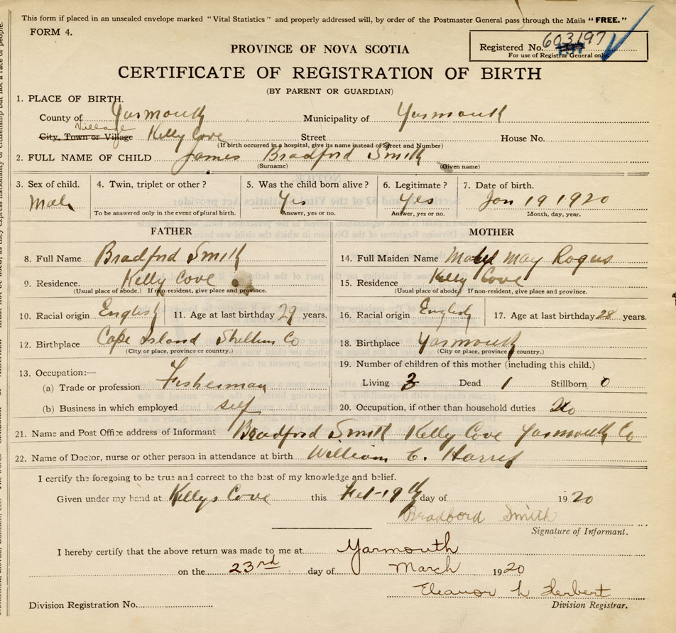 21. Name and Post Office address of Informant Bradford Smith Kelly Cove, Yarmouth Co.