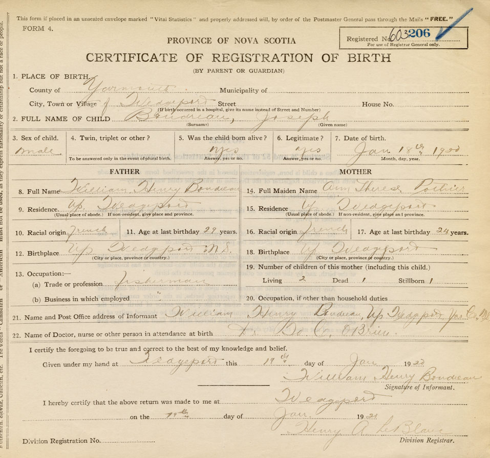 21. Name and Post Office address of Informant William Henry Boudreau Up. Wedgeport, Yar. Co.
