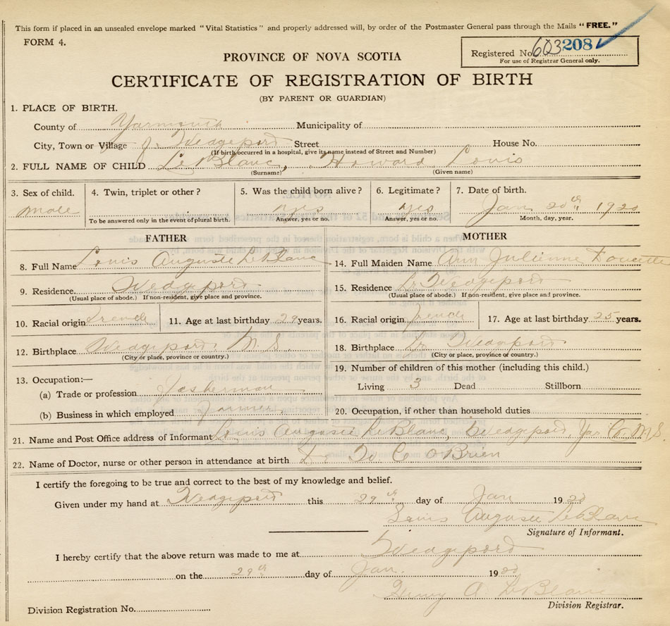 21. Name and Post Office address of Informant Louis Auguste LeBlanc Wedgeport, Yar. Co.