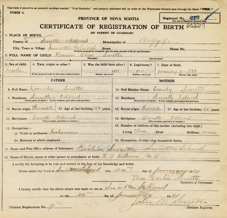 21. Name and Post Office address of Informant Cecilia Surette Surettes Island