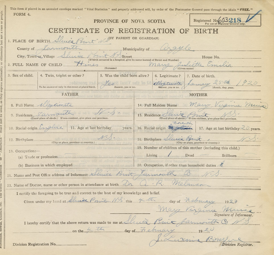 21. Name and Post Office address of Informant Mary Virginie Muise Sluice Point Yarmouth Co. N.S.