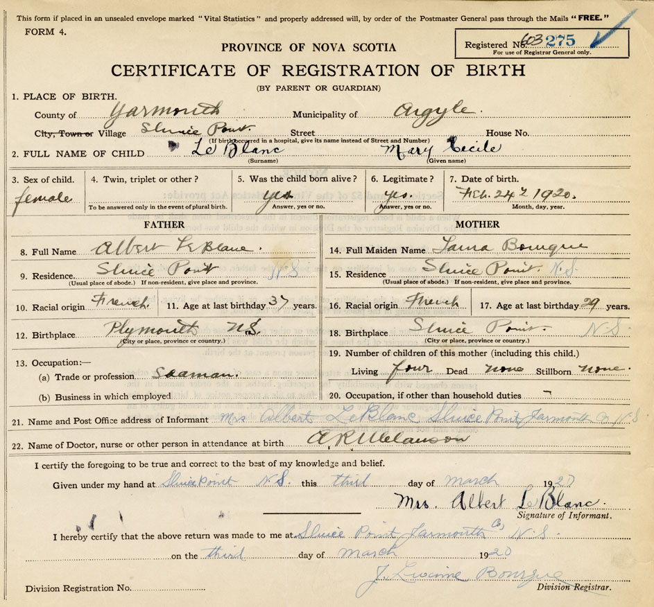 21. Name and Post Office address of Informant Mrs. Albert LeBlanc Sluice Point, Yarmouth Co.