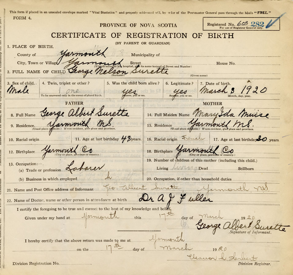 21. Name and Post Office address of Informant Geo. Albert Surette Yarmouth