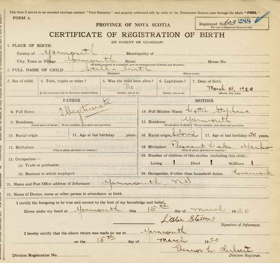 Note: African Nova Scotian - Mother seems to have signed as Stevens but form listed as Stephens in mothers information