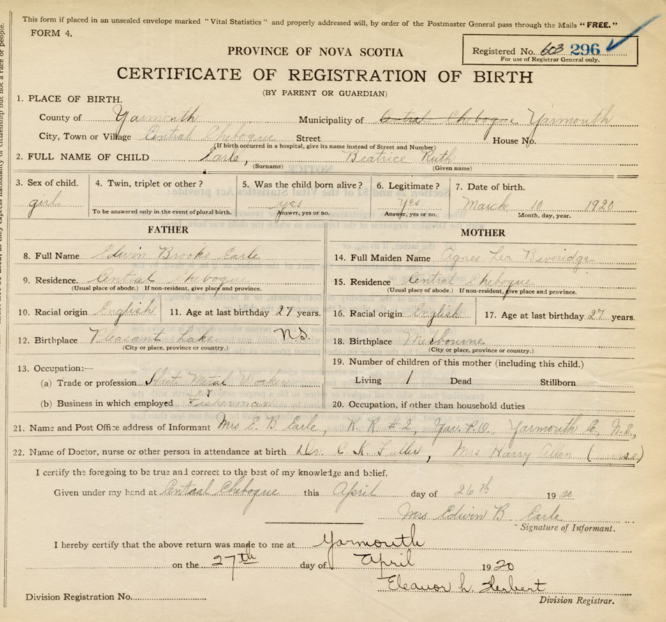 21. Name and Post Office address of Informant Mrs. Edwin B. Earle RR#2 Yar. P.O., Yarmouth Co.