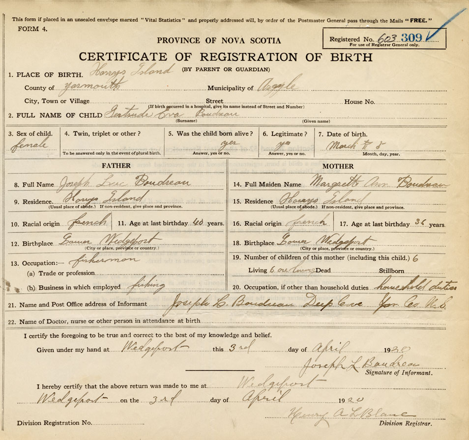 21. Name and Post Office address of Informant Joseph L. Boudreau Deep Cove, Yar. Co.