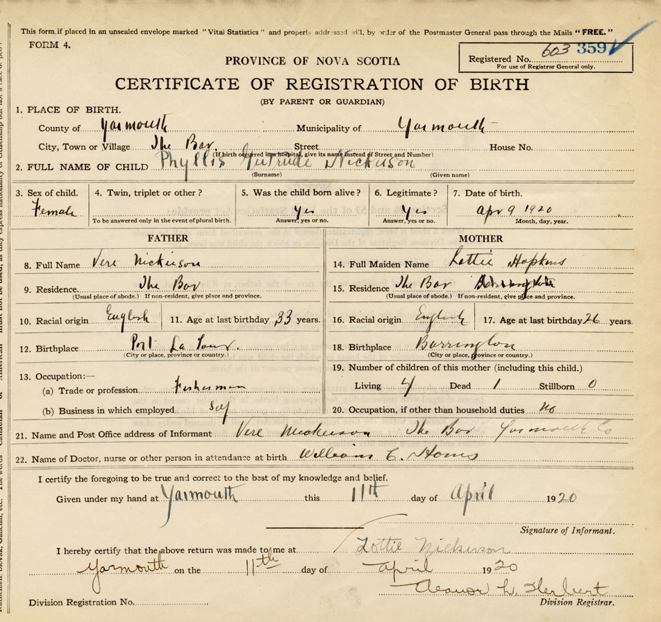 21. Name and Post Office address of Informant Vere Nickerson The Bar, Yarmouth Co.