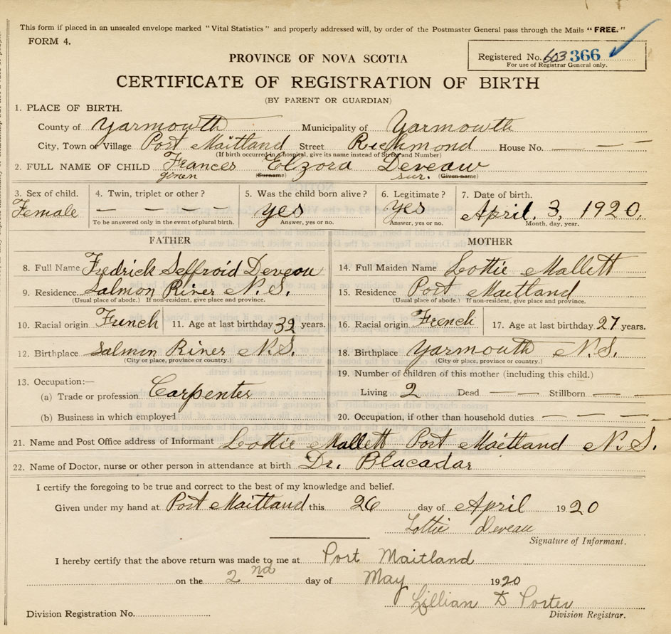 21. Name and Post Office address of Informant Lottie Deveau Port Maitland