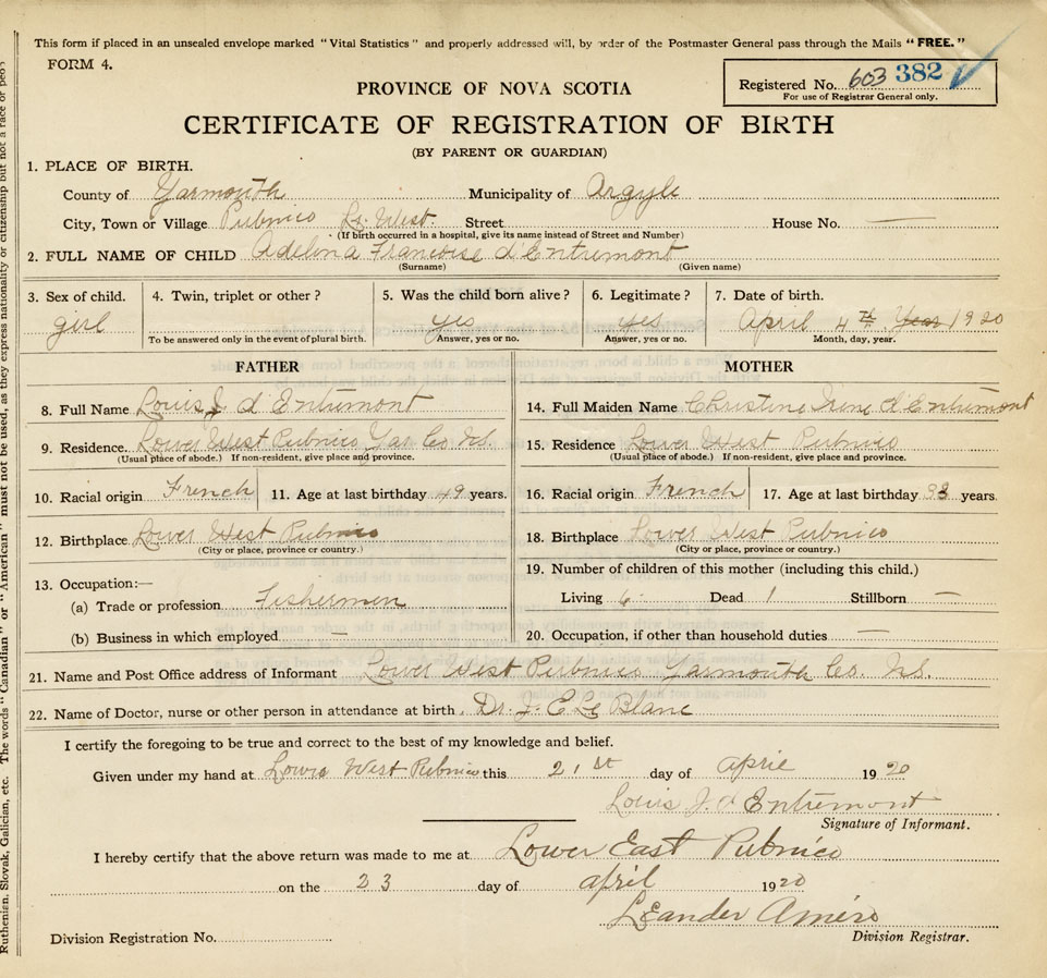 21. Name and Post Office address of Informant Louis J. d'Entremont Lower West Pubnico, Yarmouth Co.