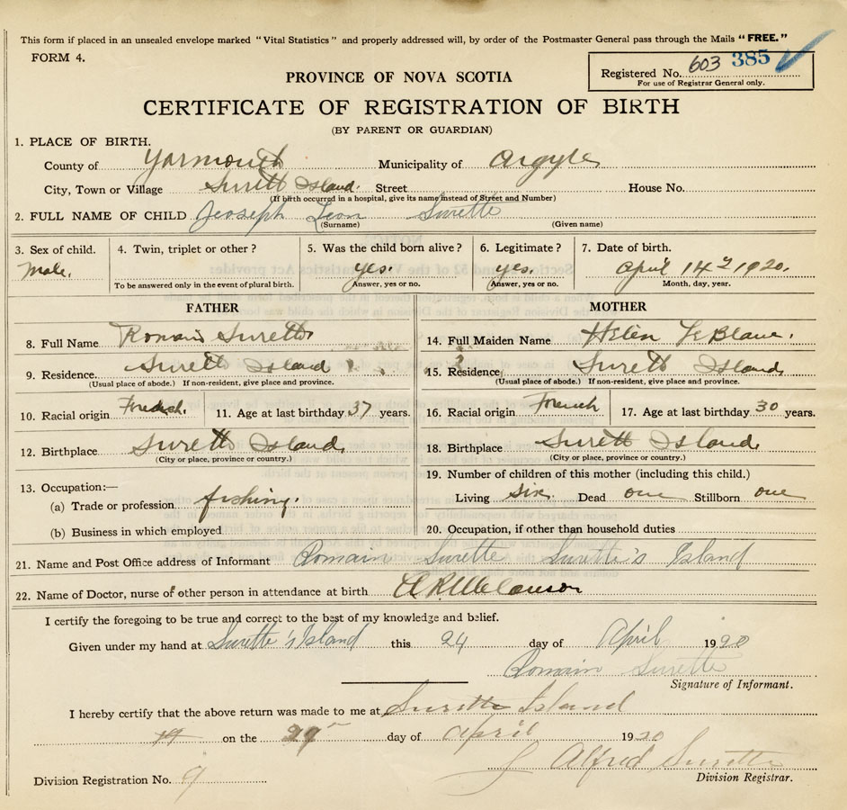 21. Name and Post Office address of Informant Romain Surette Surettes Island