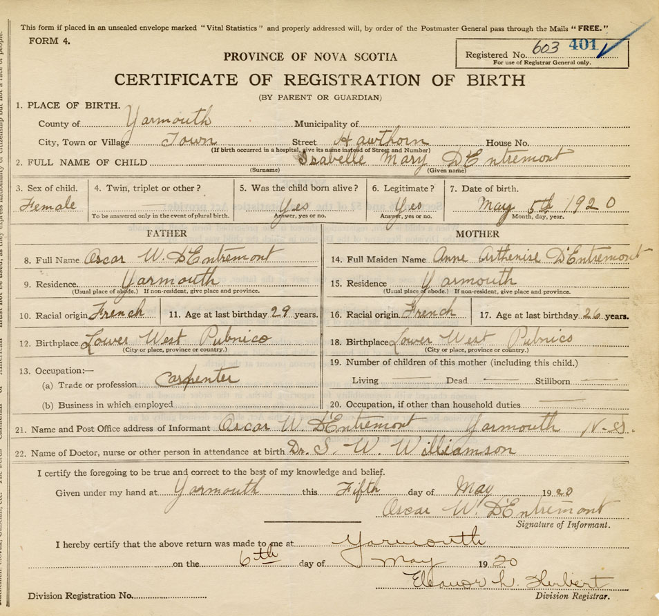 21. Name and Post Office address of Informant Oscar W. D'Entremont Yarmouth