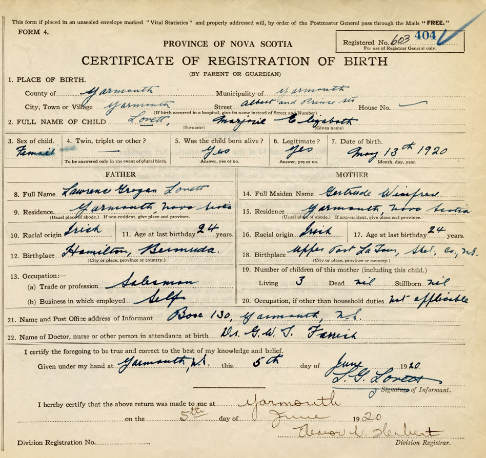 21. Name and Post Office address of Informant L. G. Lovett Box 130, Yarmouth N.S.