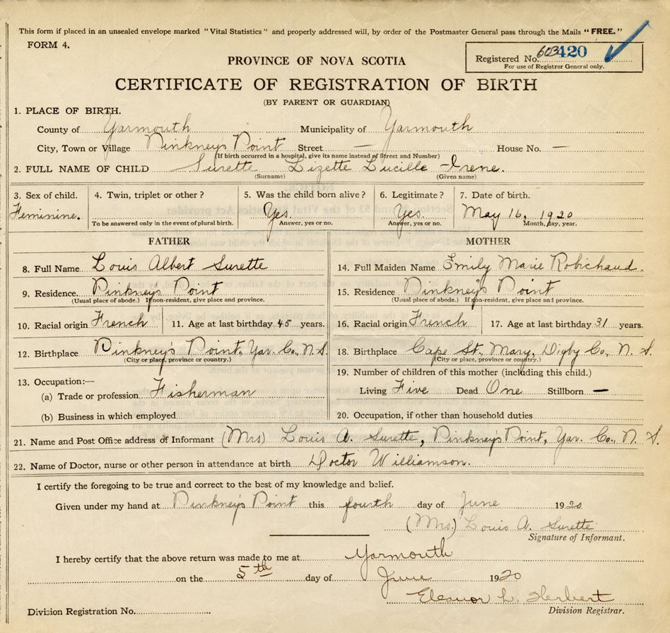 21. Name and Post Office address of Informant (Mrs.) Louis A. Surette Pinkneys Point, Yar, Co.