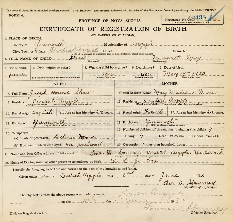 21. Name and Post Office address of Informant Eva V. Spinney Central Argyle, Yar. Co. N.S.