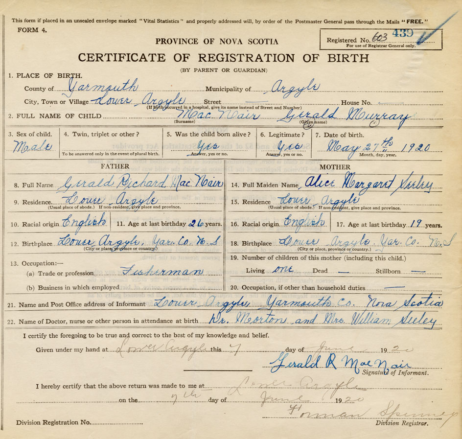 21. Name and Post Office address of Informant Gerald R. MacNair Lower Argyle, Yarmouth Co.
