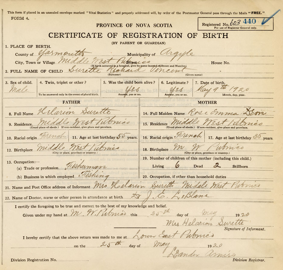 21. Name and Post Office address of Informant Mrs. Helarion Surette Middle West Pubnico