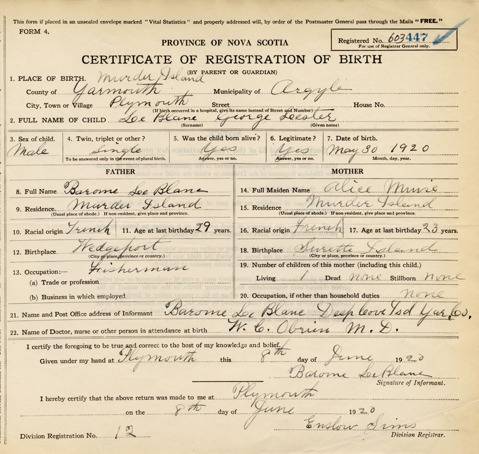 21. Name and Post Office address of Informant Barome LeBlanc Deep Cove Isd., Yar. Co.
