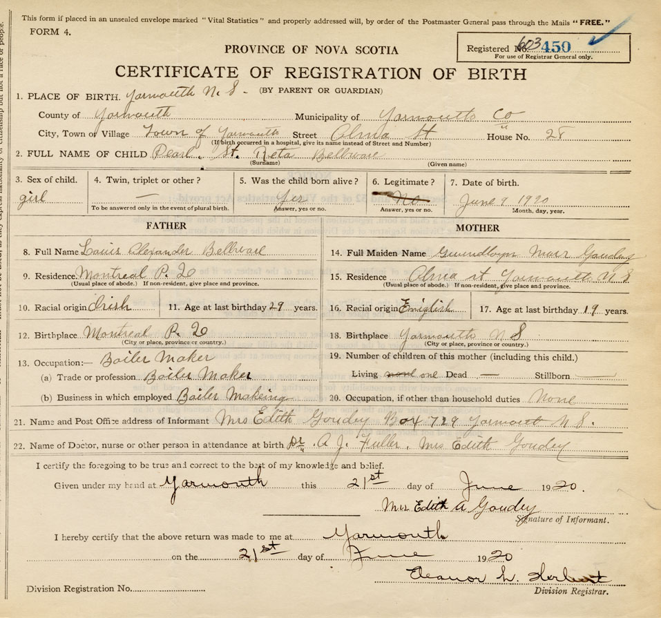 22. Name of Doctor, nurse or other person in attendance at birth Dr. A. J. Fuller, Mrs. Edith Goudey