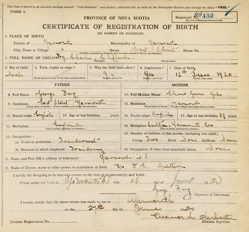 21. Name and Post Office address of Informant George Fry Yarmouth, N.S