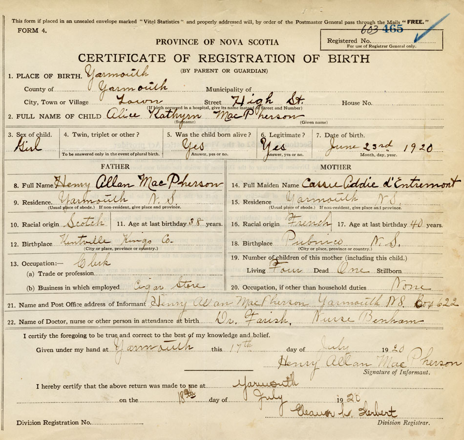 21. Name and Post Office address of Informant Henry Allan MacPherson Box 622, Yarmouth