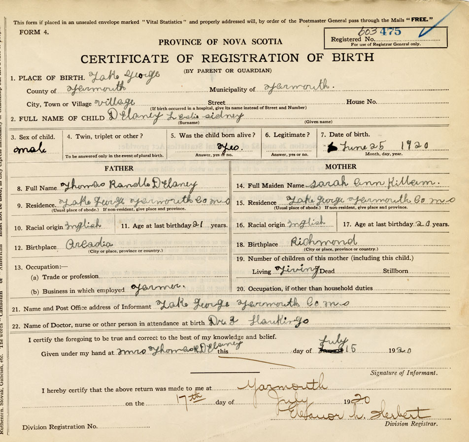 21. Name and Post Office address of Informant Mrs. Thomas Delaney Lake George, Yarmouth Co.