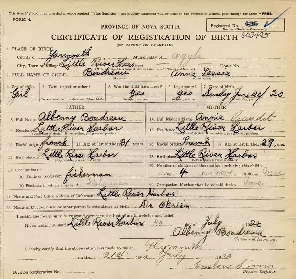 21. Name and Post Office address of Informant Albenny Boudreau Little River Harbour
